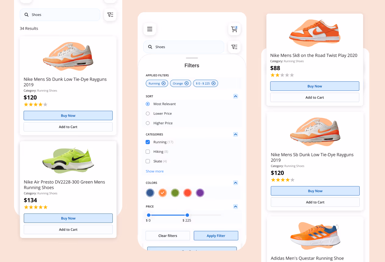 Mobile shoppers were overwhelmed by product choices. We fully rebuilt the filtering experience, using clear categories, intuitive visual chips, and smarter defaults. Users found products faster, decreasing session drop-off.